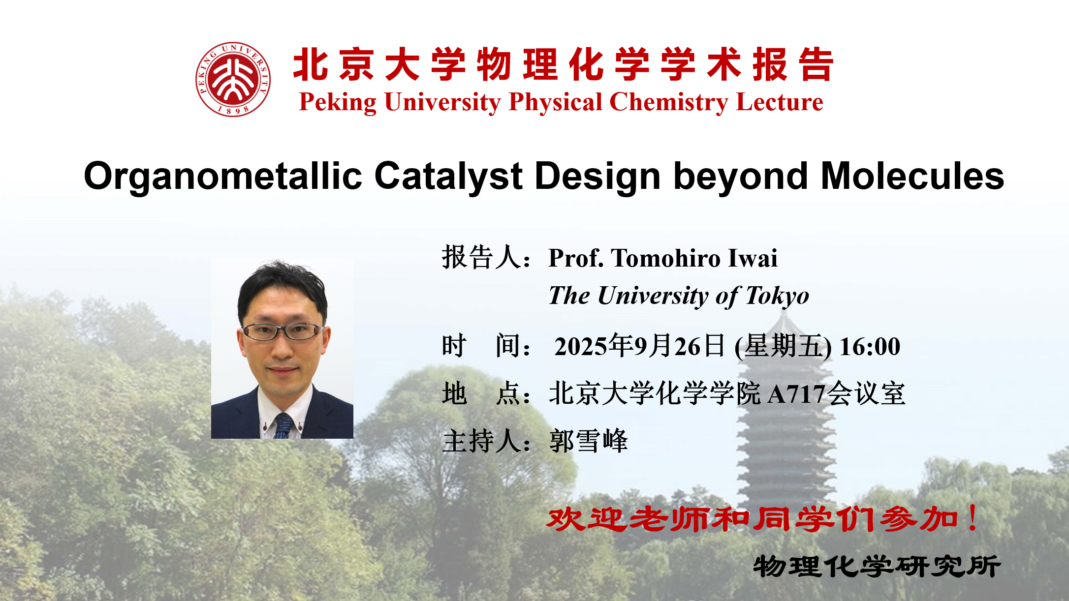 时间:2025年9月26日 (周五) 16:00 报告人:Prof. Tomohiro Iwai