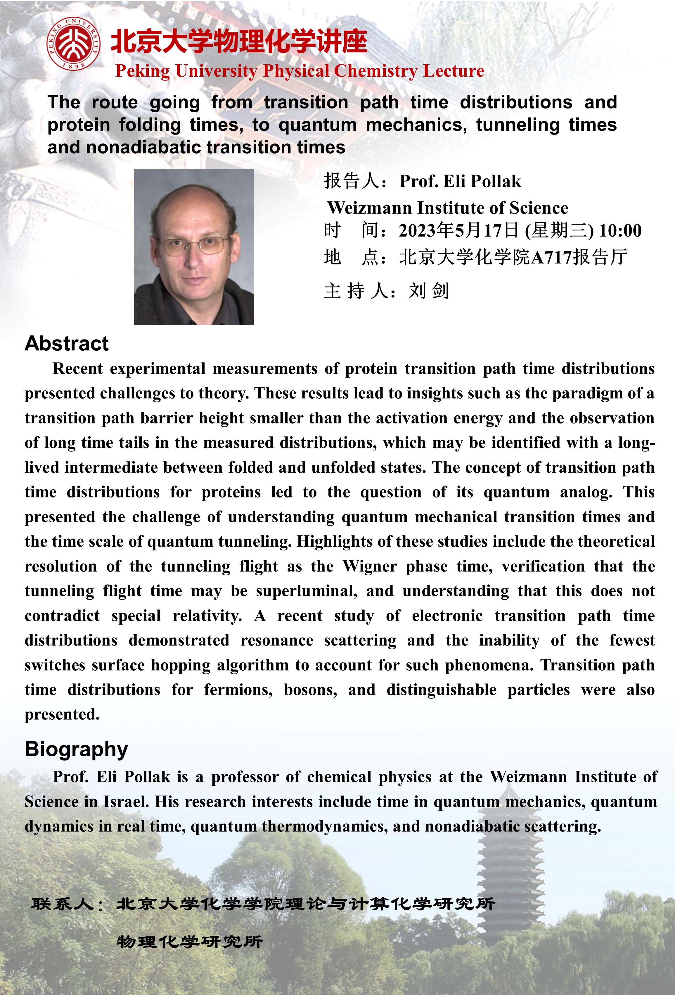 【122cc太阳成集团物理化学讲座】The route going from transition path time distributions and protein folding times, to quantum mechanics, tunneling times and nonadiabatic transition times