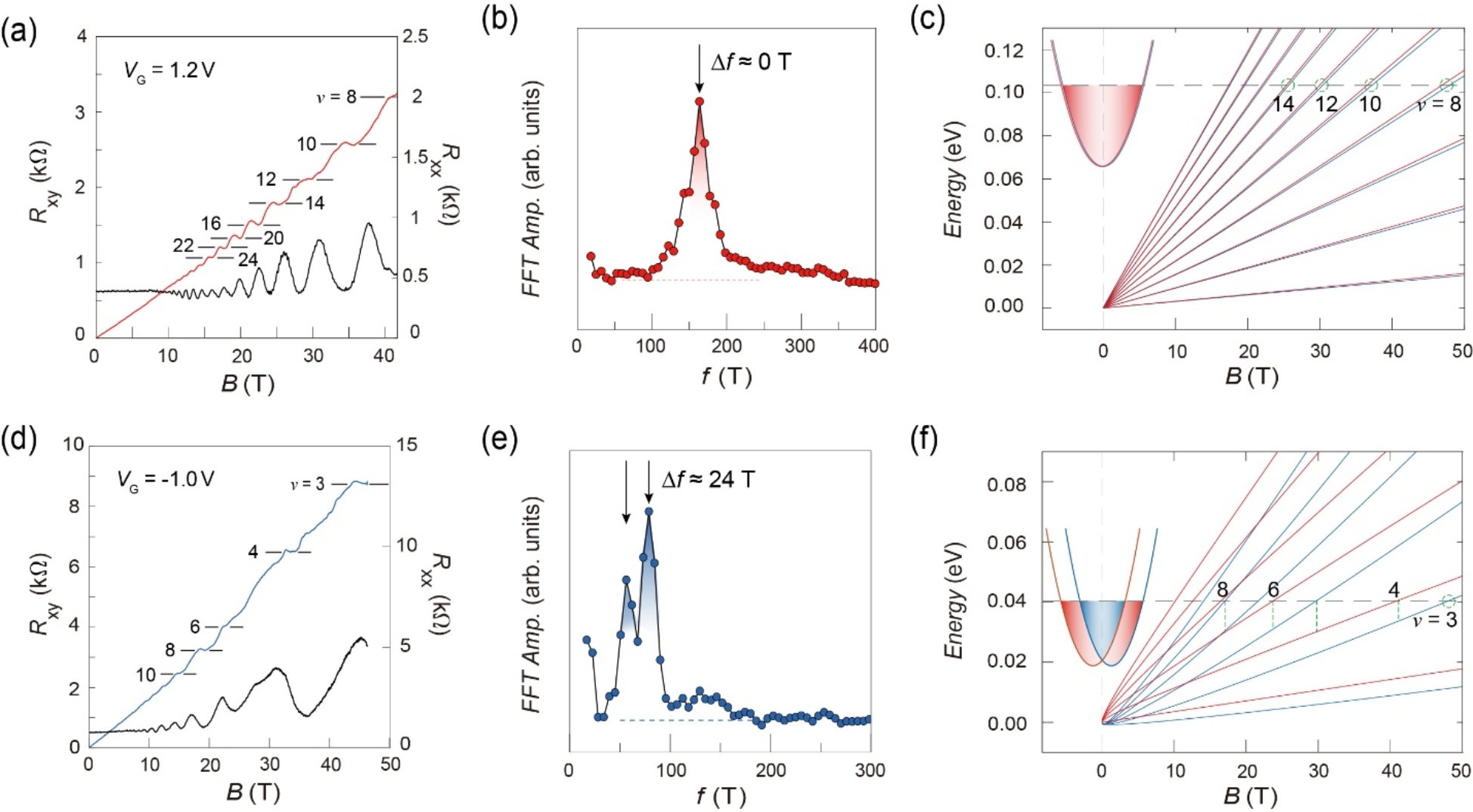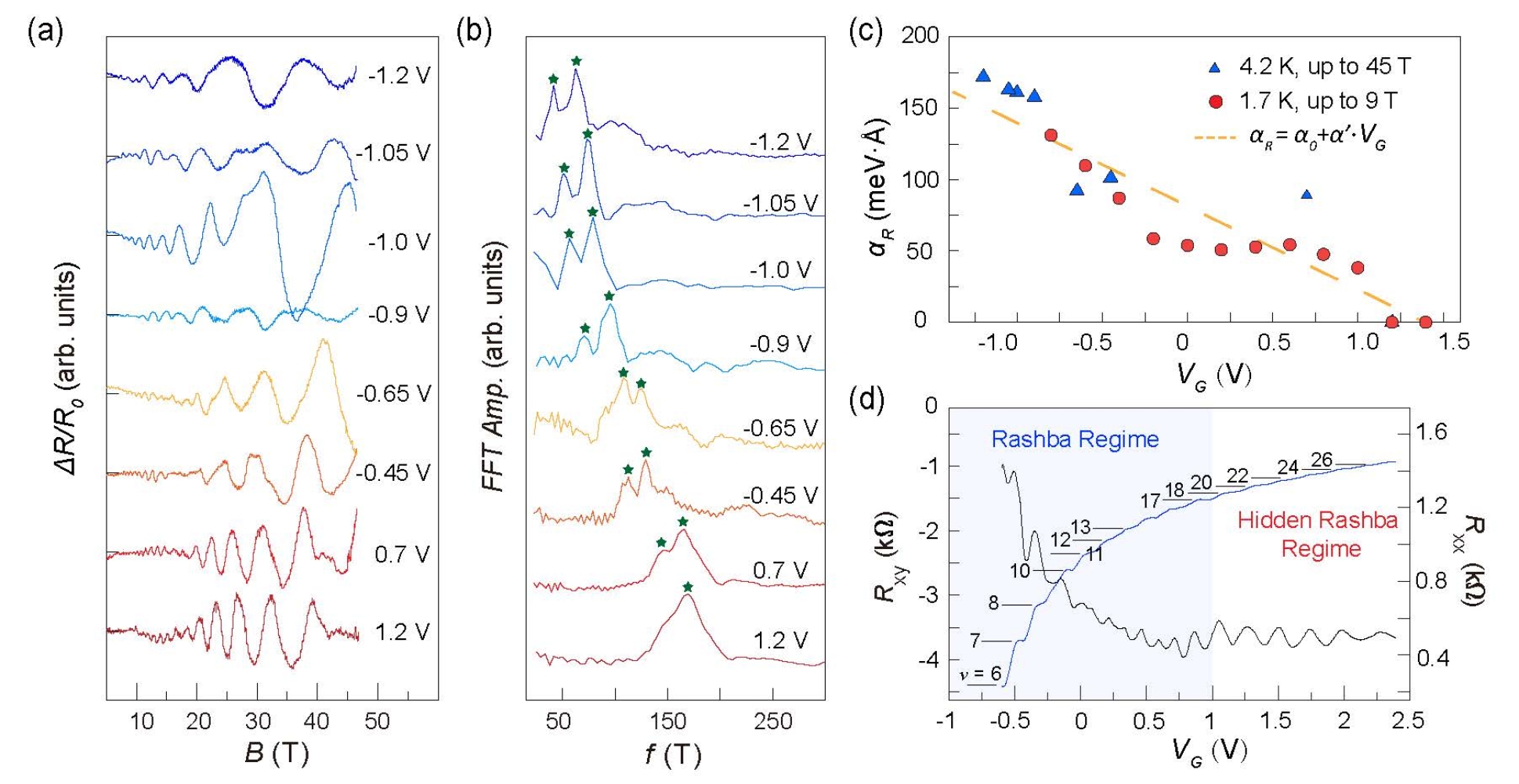 研究团队进一步结合脉冲强磁场输运测量与相关分析,揭示了静电栅压对Rashba参数的连续调控能力:随着栅压从正到负变化,体系的 Rashba 参数可从 0 以线性趋势增加至 172 meV·Å,量子振荡谱从单一峰逐渐演化为劈裂的双峰(图3a, b),对应自旋简并到自旋劈裂的连续转变,相同的线性调控趋势在 9 T 的稳恒磁场测量中也得到了重复(图3c)。而通过固定磁场大小,对栅压进行连续循环扫描,如图3(d)所示,可以观察到系统中量子霍尔态的连续奇偶转变行为,当栅压小于约 1 V时,系统由纯偶数量子霍尔态变为奇偶共存的量子霍尔态,这也与量子振荡所对应的自旋劈裂由单峰变为双峰的转变点一致,再次证明了该体系中量子霍尔态与能带自旋极化的关联性与受场效应精准调控的特性。