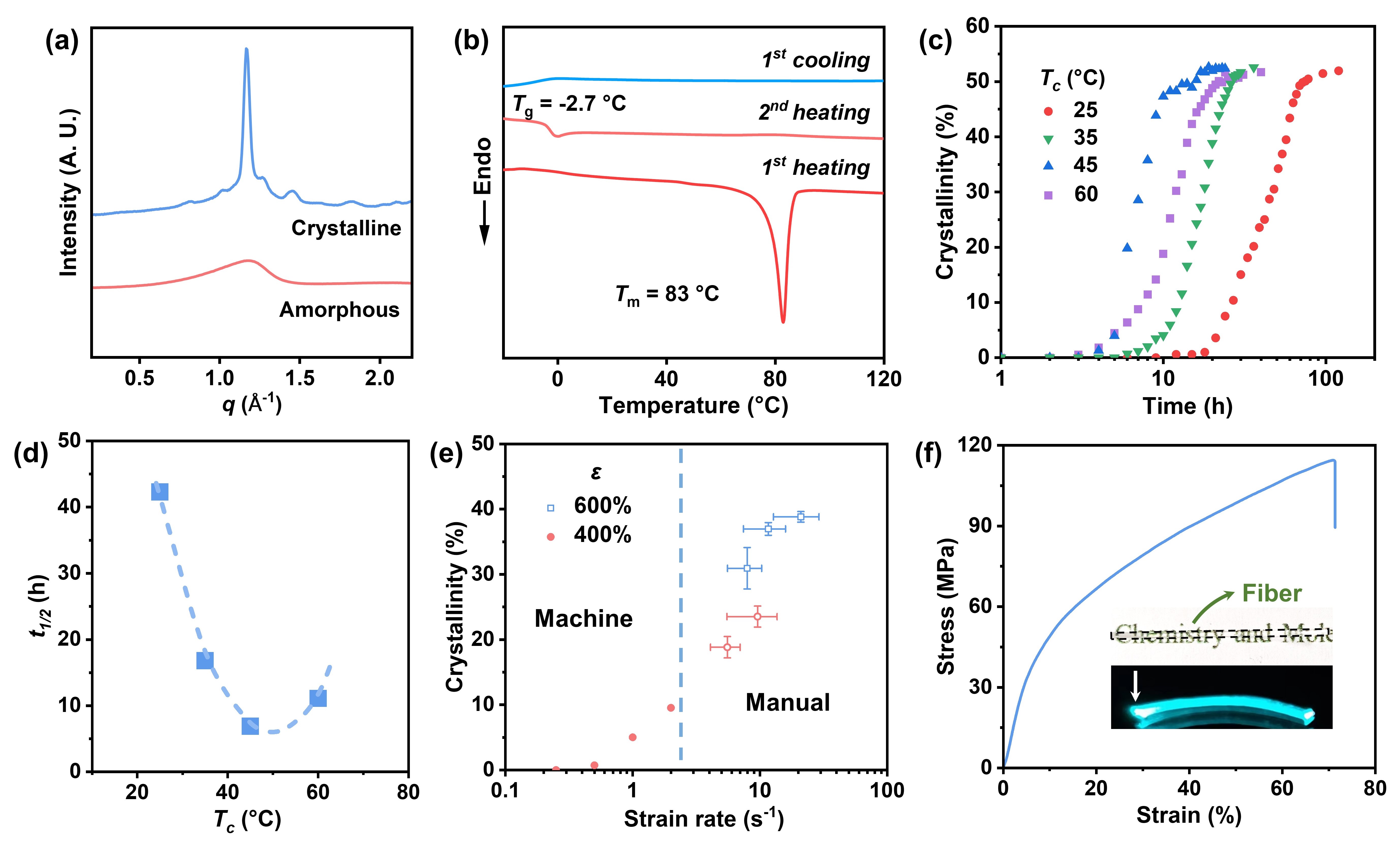图2 (a-b) 半结晶性 PaGMTE 的 WAXS 谱图和 DSC 曲线;(c-d) 不同结晶温度下,PaGMTE 的静态结晶行为;(e) PaGMTE 的拉伸诱导结晶行为;(f) 透明 PaGMTE 纤维的力学性质与光波导性质。