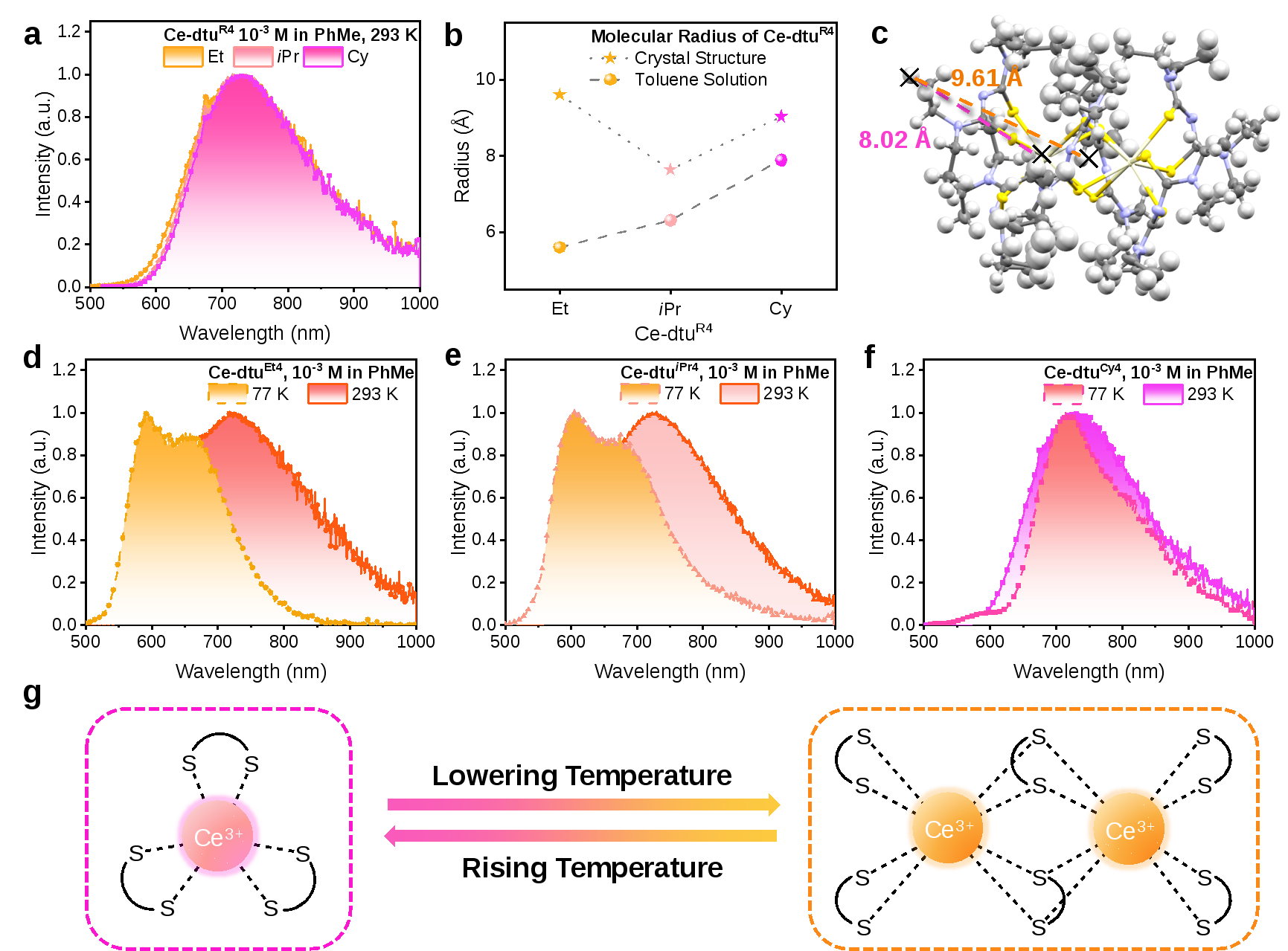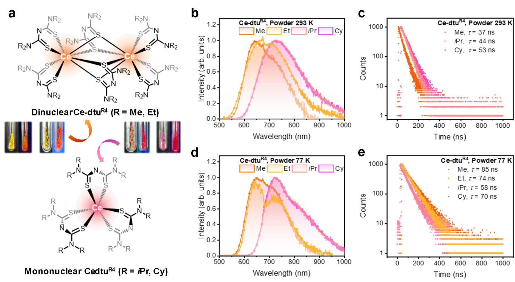 综上,该工作基于二硫代缩二脲配体,合成得到了全新的长波发射铈(III)配合物Ce-dtuR4。通过引入不同大小的位阻基团,铈(III)配合物具有不同的配位结构,并分别表现出橙红光与深红光发射,突破了铈(III)的发射波长记录。此外,变温光谱的测试结果揭示了配合物的“单核”与“双核”结构转换在溶液中的温度依赖性,展现了这类配合物在配位化学中的独特性质。上述工作不仅合成了一系列结构新颖的S配位稀土Ce(III)配合物,同时也展示了Ce(III)在全色域发光中的巨大潜力。