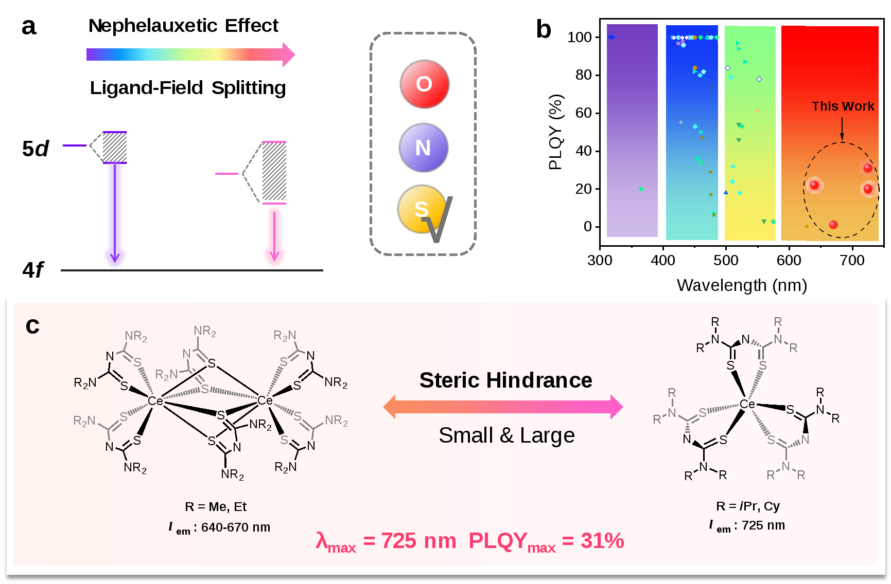 图1. 长波发射铈(III)配合物的设计思路与研究结果。(a)电子云重排效应与晶体场分裂对铈(III) 5d激发态的调控示意图;(b)目前已有铈(III)配合物的发光量子产率与峰值发射的汇总图;(c)该工作中铈(III)配合物的分子结构与光物理性质。