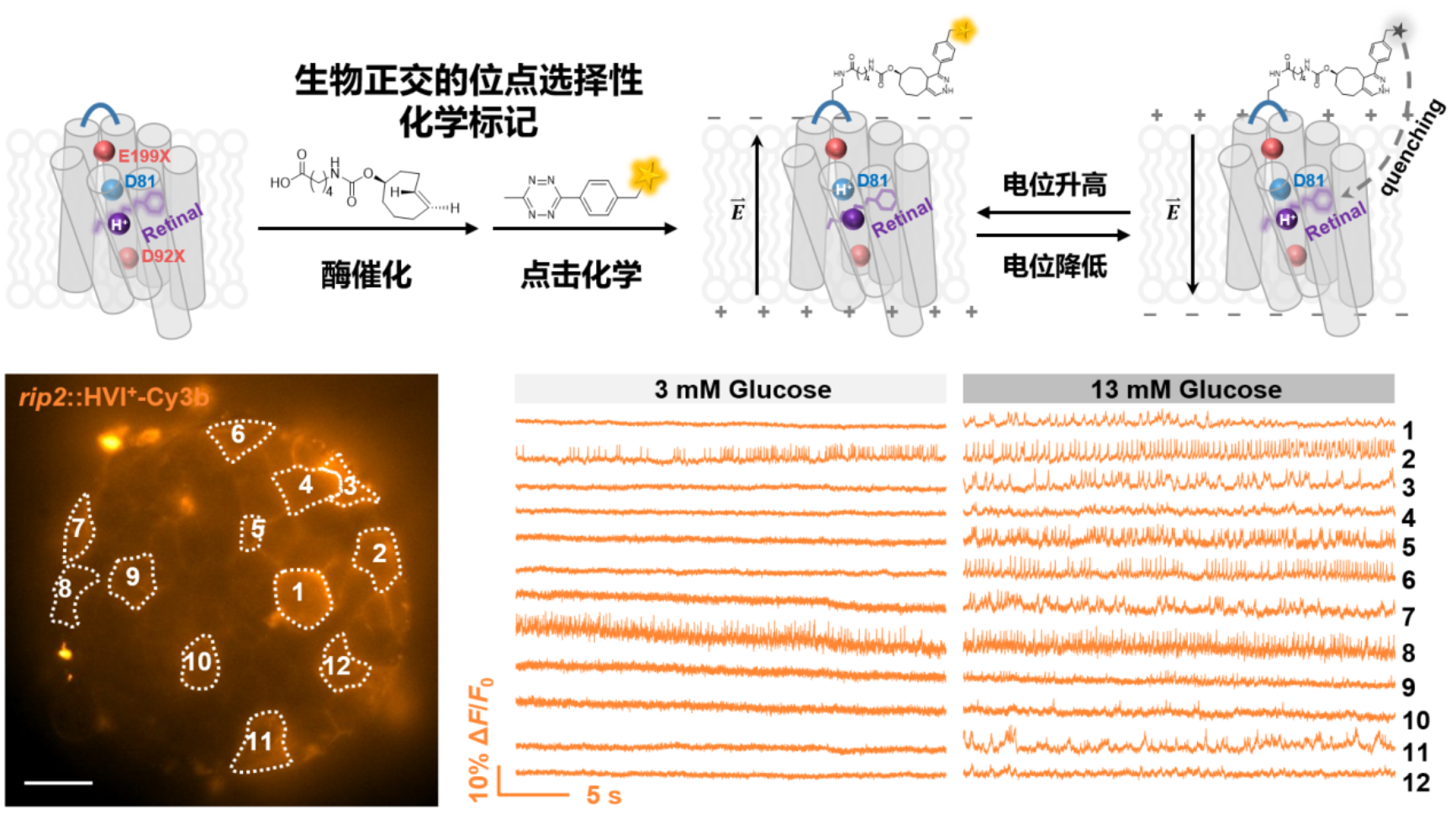 在本项工作中,三方团队通力合作,首先针对视紫红质Ace2的质子供体位点Asp92和质子释放位点Glu199进行突变筛选,调控视黄醛席夫碱的质子平衡,从而逆转探针对膜电位的响应极性。随后,通过连接酶介导的化学标记与逆电子需求狄尔斯-阿尔德反应,将高量子产率的橙色染料Cy3b精确引入工程化改造的视紫红质蛋白特定位点(图1)。最终,研究团队利用该探针观测了不同葡萄糖浓度对胰岛α与β细胞群电活动的调控作用,展示了其在生理研究中的潜力。