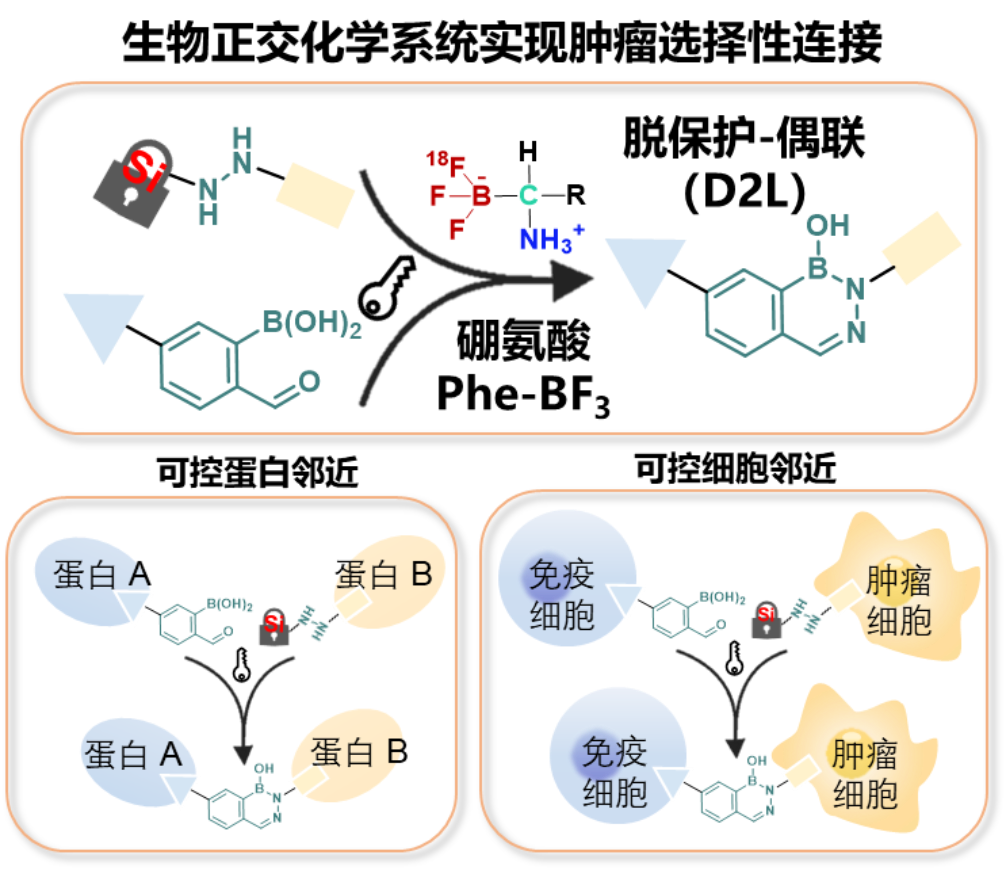 在癌症治疗领域,诱导邻近已成为一种新兴的治疗模式(如PROTACs、CAR-T、双特性T细胞衔接器BiTE等),通过特异性结合,改变靶标命运,诱导蛋白降解或细胞死亡。然而,由于大多数靶抗原在非肿瘤组织上也有表达,由此产生的“on-target off-tumour (OTOT)”毒性已成为邻近介导疗法临床发展的主要障碍之一。PROTACs技术因其催化特性可能导致治疗窗口狭窄,全身性给药时可能因“on-target”效应引起严重毒性。同样,部分免疫治疗患者则出现细胞因子风暴甚至致命的心肺毒性,这是免疫效应反应过度的结果。为克服这些难题,亟需实现肿瘤局部、按需激活的药物递送与免疫调节新策略。生物正交化学作为一种特异性高、反应温和的分子工具,已被应用于体内标记、药物递送等领域,但如何实现其在肿瘤中的靶向组装与精准激活尚未解决。