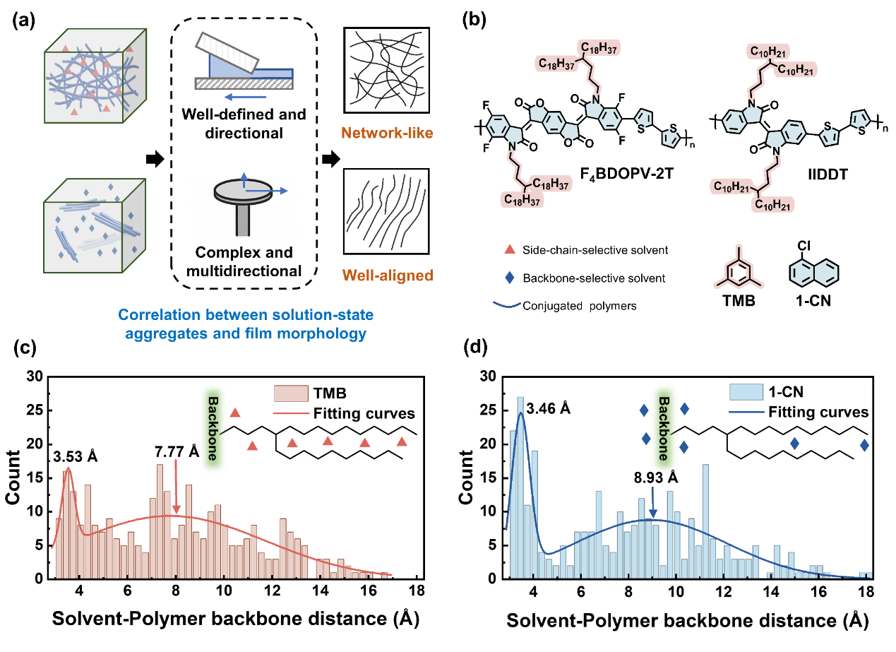 图1|溶液态聚集调控共轭高分子链取向。(a) 示意图展示了F4BDOPV-2T在不同溶剂及加工方式下,溶液聚集结构与薄膜形貌之间的关系。(b) F4BDOPV-2T、IIDDT、TMB和1-CN的化学结构。(c、d) 分别为F4BDOPV-2T在TMB和1-CN溶液中,溶剂分子与共轭主链距离分布的统计结果。