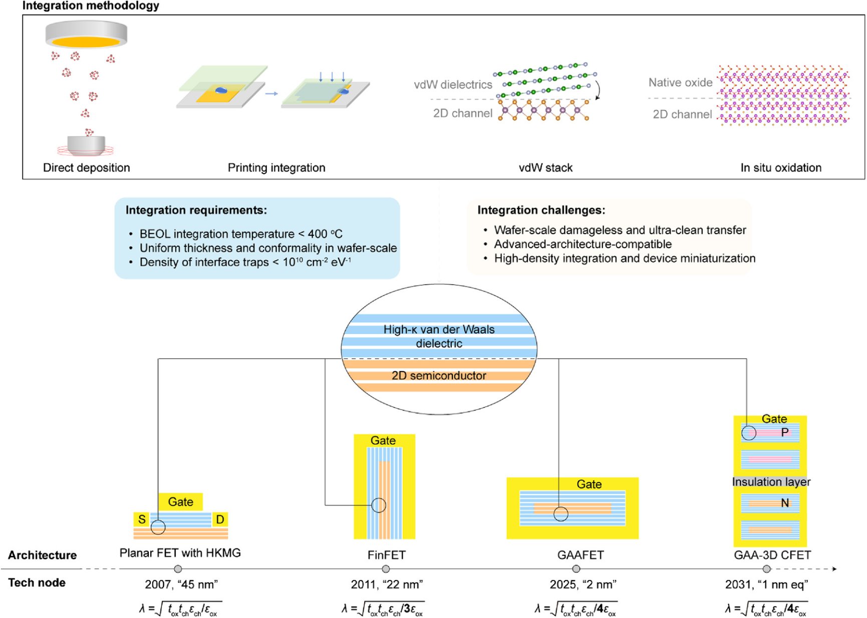 图3. 高 κ 范德华型绝缘体与二维半导体在晶圆级集成过程中的挑战与发展路线图 (CCS Chem. 2026)