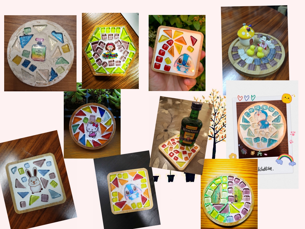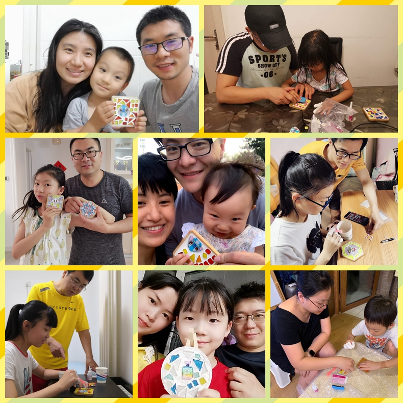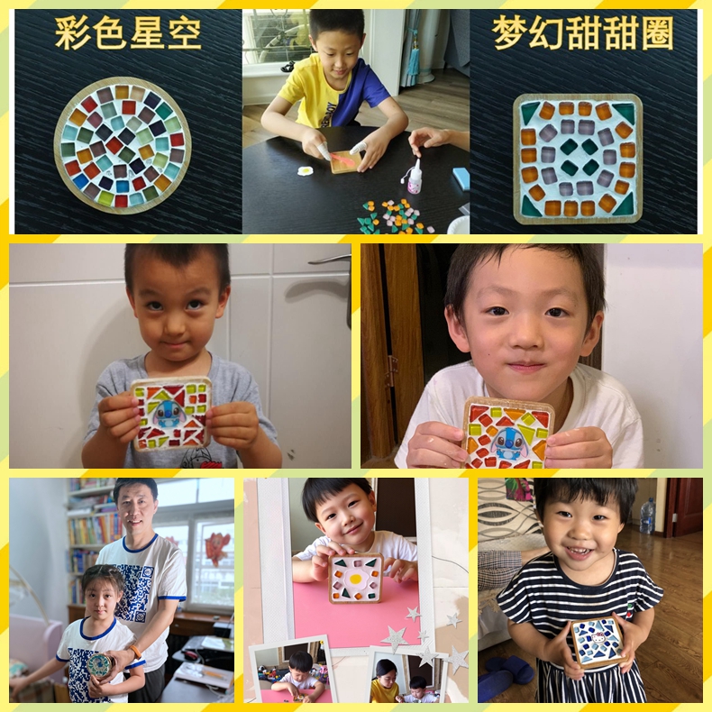 活动通知发出后投稿十分踊跃,分享的照片让我们惊叹于小朋友们无限的创造力和丰富的想象力。几块简单的马赛克和一个木头杯垫在小朋友们灵巧的双手中演变成了多姿多彩的设计作品:彩色星空、梦幻甜甜圈、椰子树、香水瓶、小公主、儿童乐园、动物走迷宫、快乐小屋、扬帆起航、哆啦A梦寻宝记∙∙∙∙∙∙。投稿的照片和文字也让我们感受到其乐融融的家庭亲子氛围,仿佛听到了每一个温馨的家里爸爸妈妈和孩子们的欢声笑语。