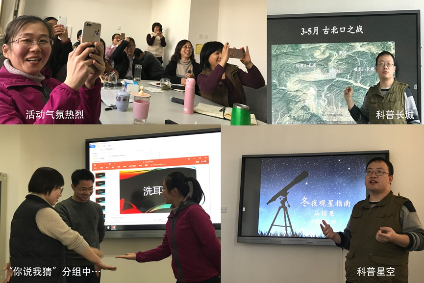 随后,实验教学中心的“科普名嘴”马锴果老师为大家做了“古北长城抗日史”和“冬夜星空”两个科普讲座。“古北长城抗日史”讲座以地理为辐,时间为轴,展开了一幅中国军队铁血抗击日本侵略者的历史画卷,令听众感受到了战争年代的悲壮,同时也更加珍惜今天的美好。教职工们深深体会到,活在当下的我们是幸运的,也是幸福的。我们远离了当年烽火连天的苦难,沐浴在和平发展的阳光之下,但是战争与烽火从未远去,我们要居安思危、奋发图强、砥砺前行。
