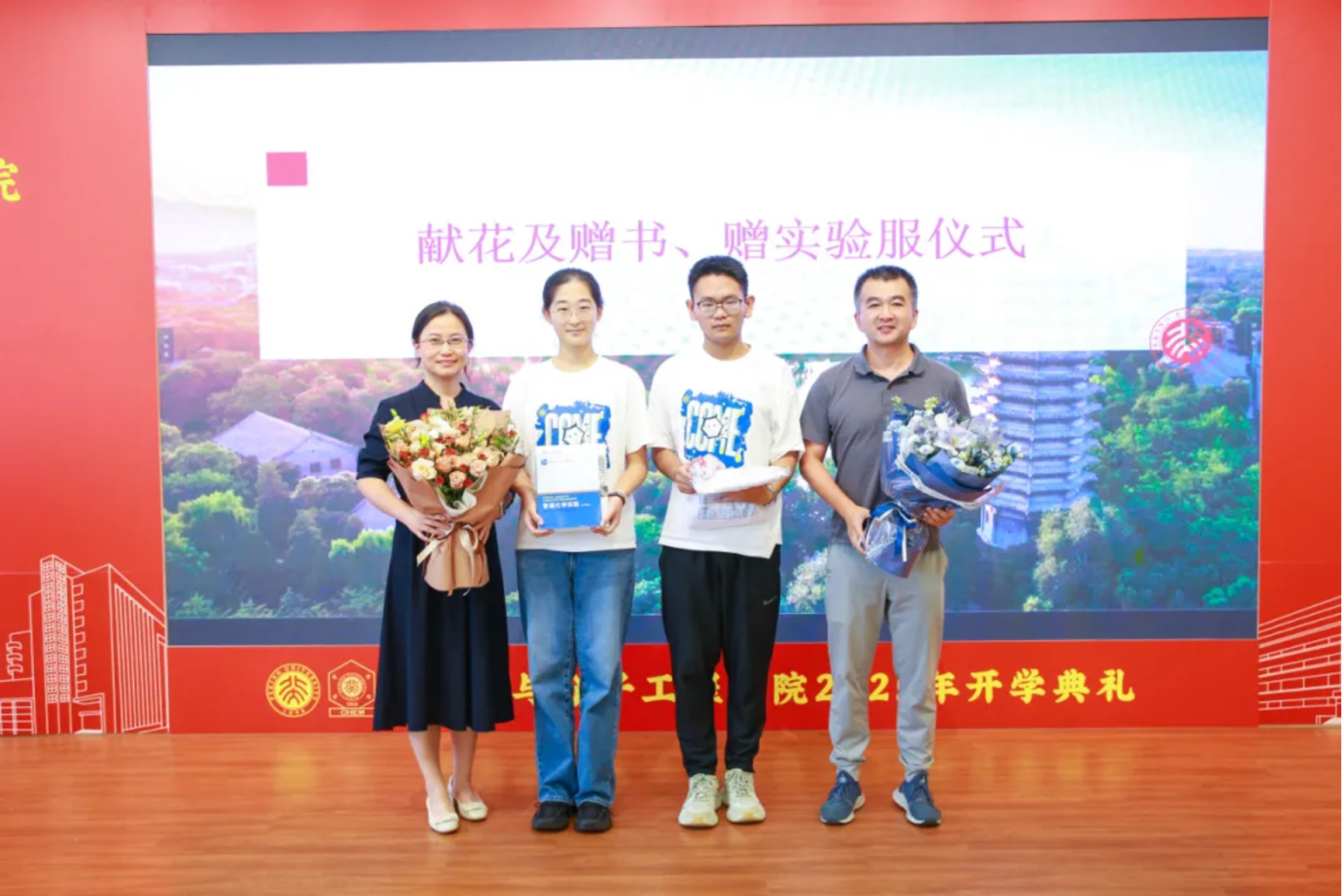 学院每年都会为大一新生统一购置并赠送专业必修课教材,帮助同学们顺利开启在燕园的学习生涯。今年,学院在延续这一传统的基础上,还为全体新生配发了实验服与护目镜,助力大家更好地走进实验科学的世界。党委副书记高珍为新生赠书,化学基础实验教学中心副主任郑捷为新生赠送实验服和护目镜。学生代表孙宸宇、秦祎琪代表全体新生领取教材及实验防护用品,并向老师们敬献鲜花,表达感激之情。