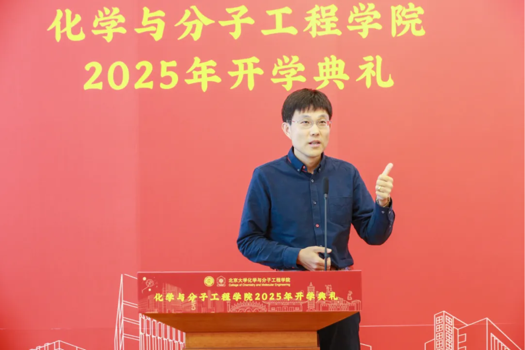 化学学院副院长杨四海作为教师代表致辞。他以“师兄”的身份,结合个人经历,分享了关于“坚持”与“活在当下”的人生体会。他回顾了自己在高考和学习过程中所采用的“笨办法”,强调真正破解难题往往依靠的是持之以恒的努力,并鼓励同学们在未来四年中勇敢迎接学业挑战、始终不懈坚持,最终收获属于自己的独特成就。同时,他借天津人朴实的生活智慧,勉励新生珍惜青春时光,勇于尝试、活出精彩,并寄语大家在北大化院度过一段难忘的“少年游”,四年之后学有所成、不负韶华。