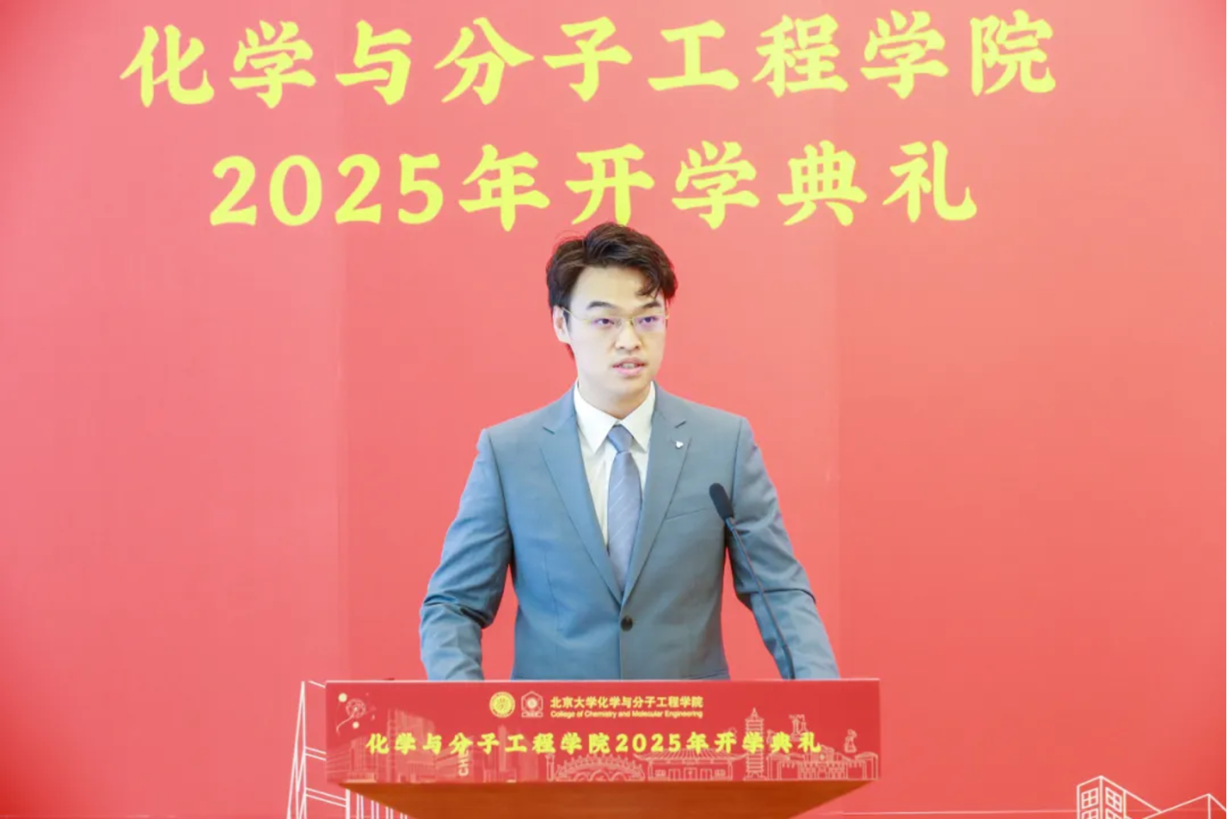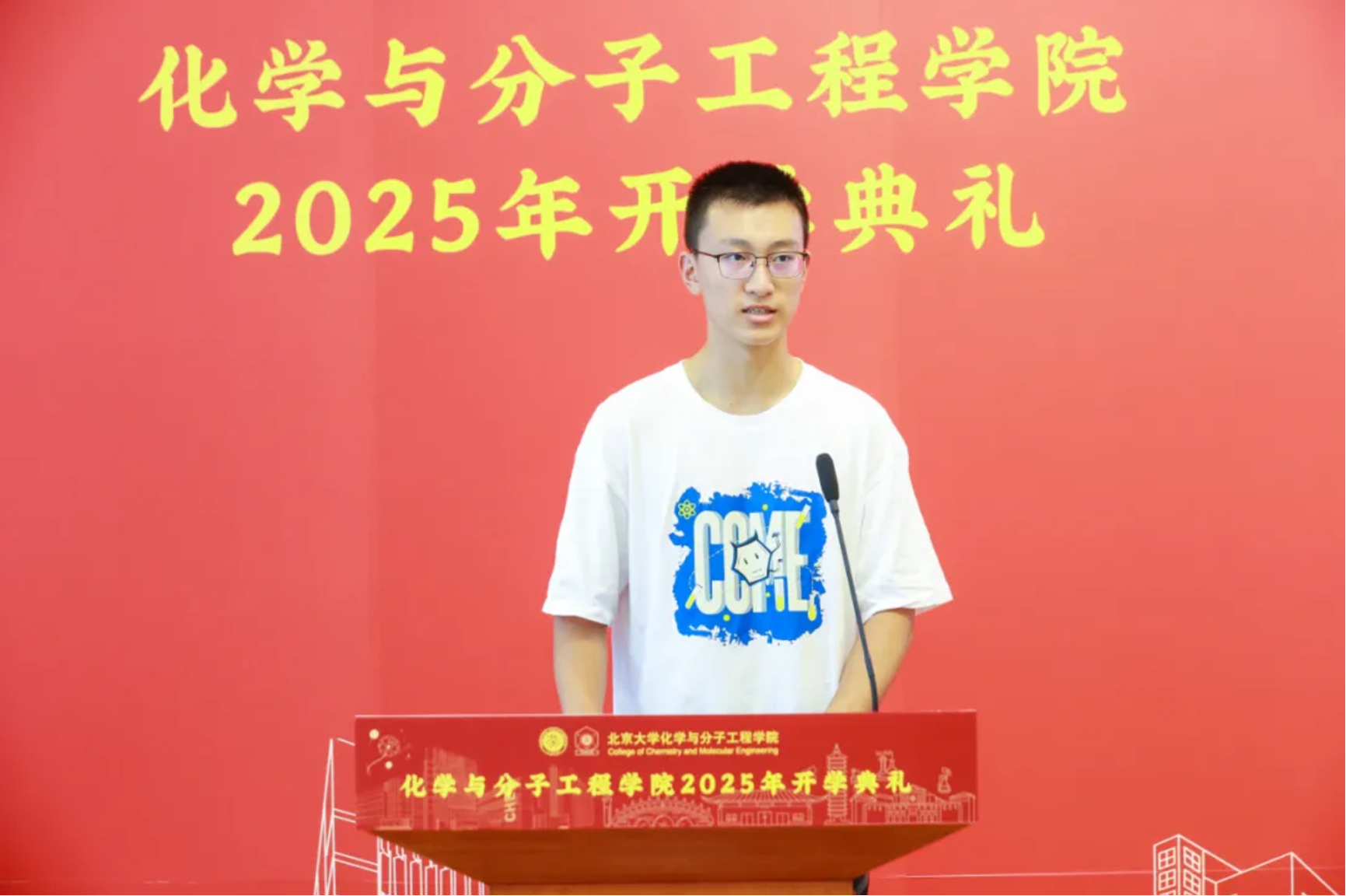 化学学院2022级本科生雷天正作为在校生代表发言,分享了自己在校期间的成长体会与感悟。他回顾了三年来在学习科研、学生工作以及社团活动等方面的经历,深切体会到大学既是“探索式学习”的重要舞台,也是拓展兴趣、融入集体的宝贵平台。他勉励新同学们勇于尝试、多元发展,在扎实的知识积累与系统的科研训练中持续提升自我,并在丰富的课余活动中收获友谊与成长。雷天正表示,来到北大化院,既要始终保持对学术的热爱与追求,也要不断思考人生方向,将个人理想与国家需求紧密结合,在奋斗中实现青春价值。