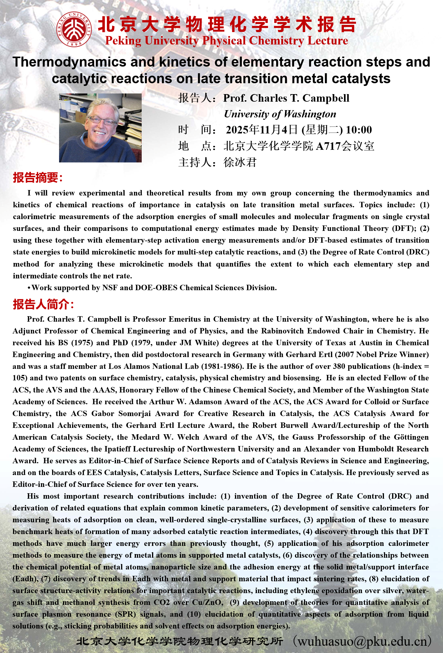【122cc太阳成集团物理化学学术报告】Thermodynamics and kinetics of elementary reaction steps and catalytic reactions on late transition metal catalysts
